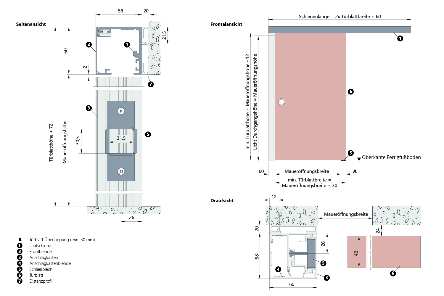 • Laufschienen-Länge = Türblattbreite x 2 + 60
