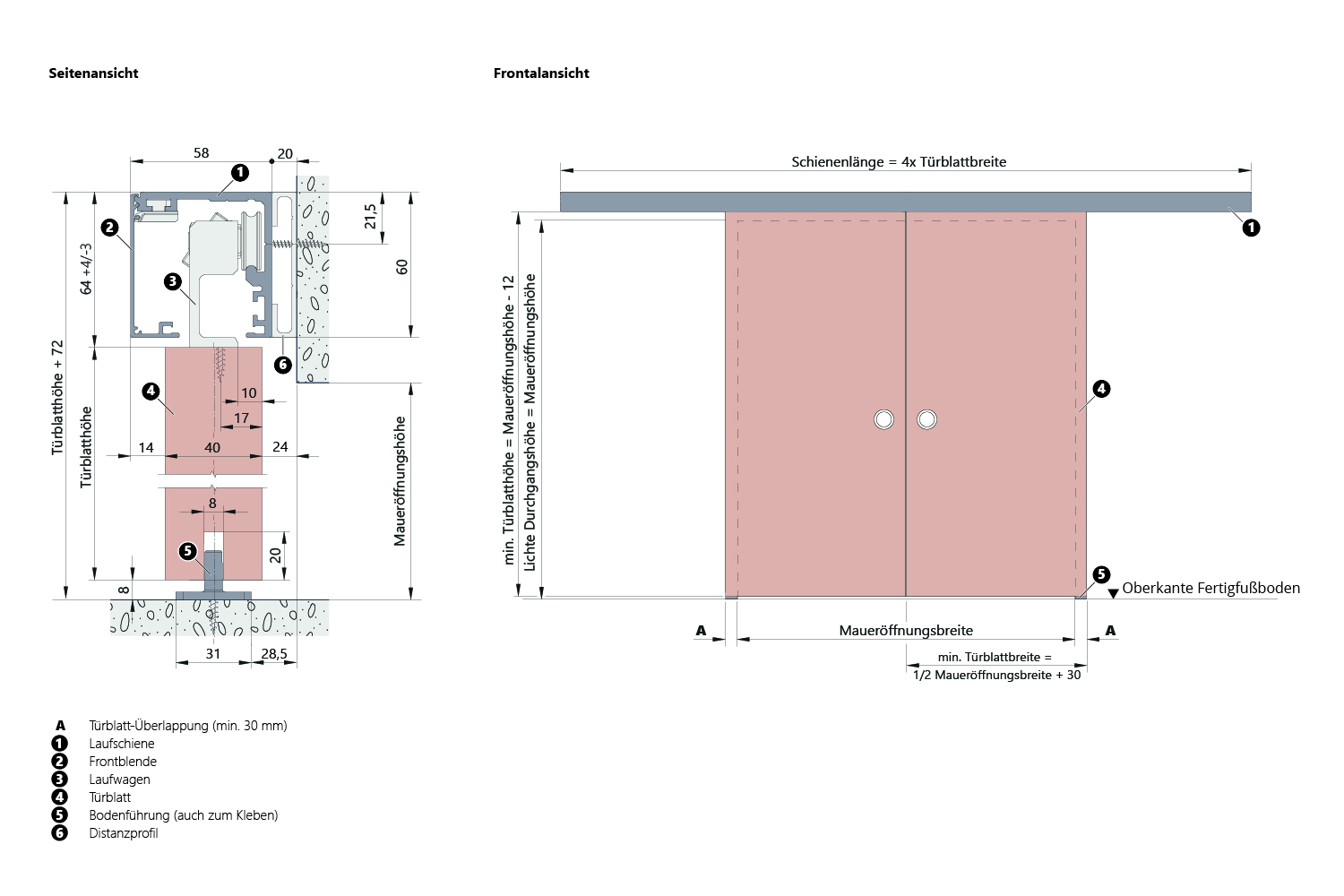 Dieses hochwertige System passt perfekt zu Ihrem doppelseitigen Traval-Türblattset und sieht dank seiner geringen Höhe von nur 60 mm und einer Tiefe von nur 58 mm (ohne Distanzprofil) besonders schlank und elegant an der Wand aus. Wir fertigen das System genau nach Ihren Wünschen an, mit einer Schienenlänge, die der Breite Ihrer Wandöffnung multipliziert mit 2 entspricht.
